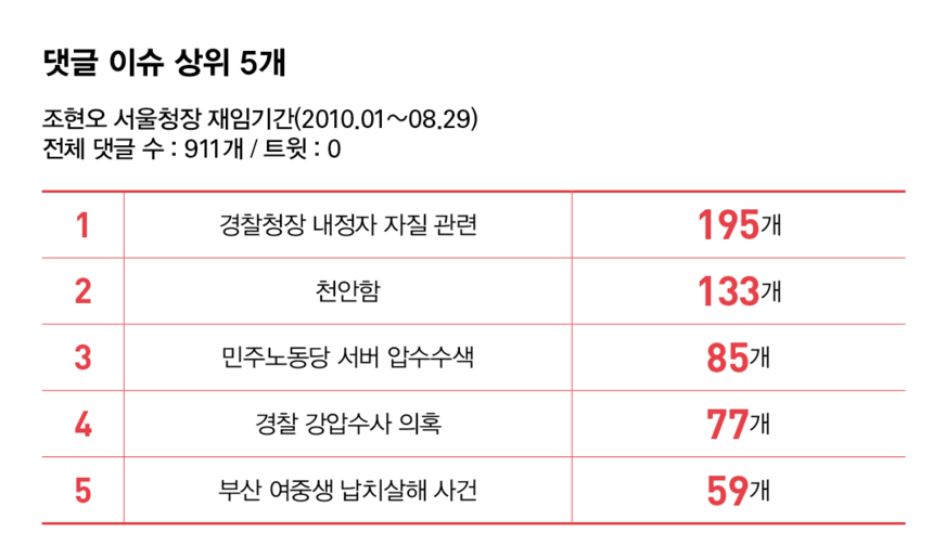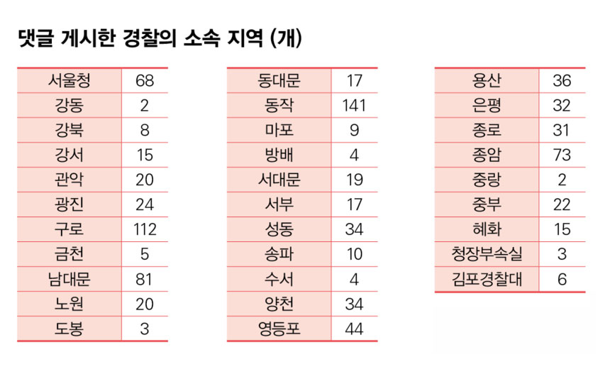 조현오 전 경찰청장이 서울지방경찰청장으로 재직하던 때 경찰이 조 전 청장의 개인적인 사안에 가장 많은 댓글을 작성한 것으로 파악됐다. 시사저널은 조 전 청장이 서울지방경찰청장으로 재직한 2010년 1월8일부터 8월29일까지의 댓글 911개를 따로 분석했다.