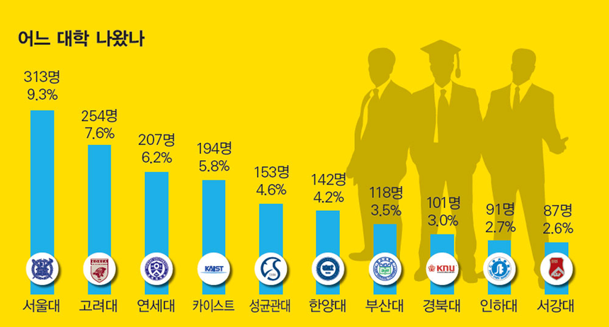 이들 기업이 지난해 금융감독원 전자공시시스템에 공시한 2017년 사업보고서에 따르면, 전체 임원 가운데 유학파가 747명(22.3%)으로 가장 높게 나타났다. 국내 대학의 경우 서울대가 313명(9.3%)으로 1위를 차지했다. 뒤를 이어 고려대 254명(7.6%)과 연세대 207명(6.2%), 카이스트 194명(5.8%), 성균관대 153명(4.6%), 한양대 142명(4.2%), 인하대 91명(2.7%), 서강대 87명(2.6%) 순이었다.