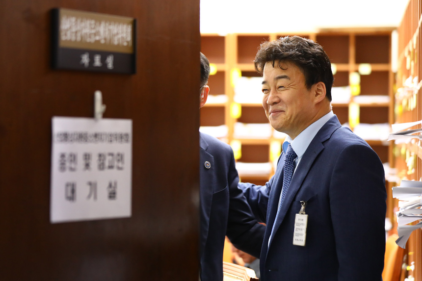 12일 오후 국회에서 열린 중소벤처기업부 국정감사에 출석하기 위해 백종원 더본코리아 대표이사가 대기실에서 사진 촬영 요청을 받으며 대기하고 있다. ⓒ 박은숙 기자