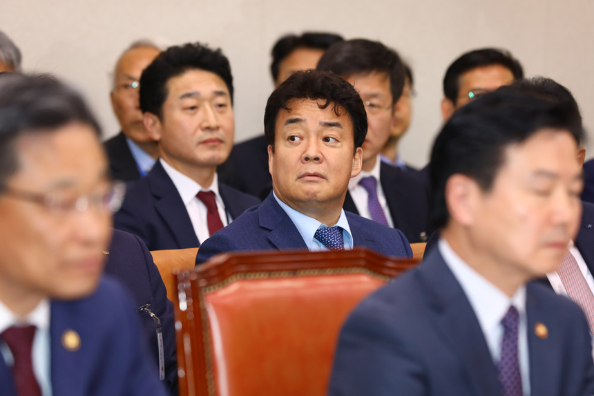 외식사업가 백종원 더본코리아 대표이사가 12일 국회에서 열린 산업통상자원중소벤처기업위원회 국정감사에 출석해 의원들의 질의를 듣고 있다. ⓒ 박은숙 기자