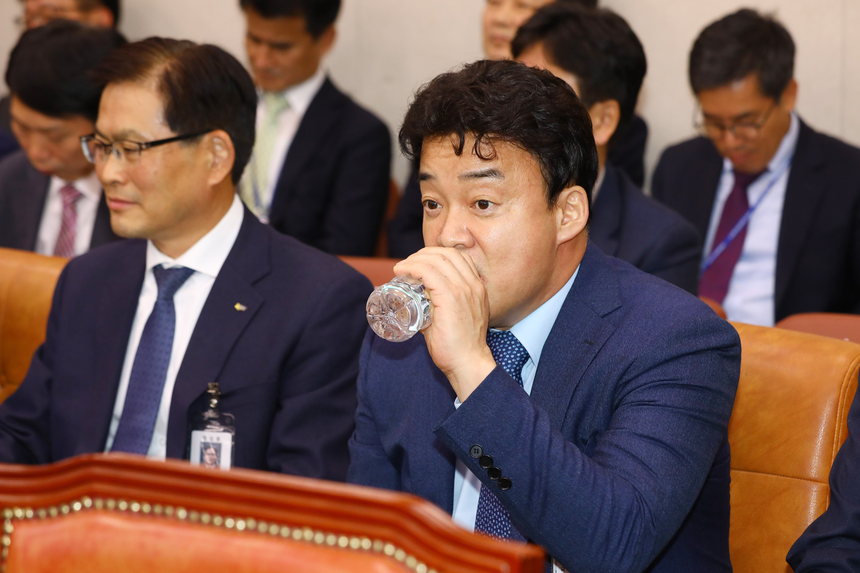 백종원 더본코리아 대표가 12일 국회에서 열린 중소벤처기업부 국정감사에서 의원들의 질의에 답변을 마친 후 물을 마시고 있다. ⓒ 박은숙 기자