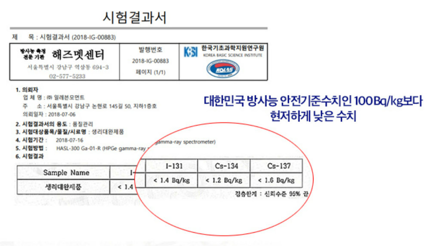 '라돈 생리대' 의혹받은 업체가 공개한 시험 결과서에서 요오드와 세슘 발견