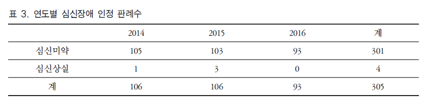 앞선 논문의 저자 조선대학교 경찰행정학과 정세종 교수와 한세대학교 경찰행정학과 신관우 교수는 “우리나라 법원은 심신미약을 인정하는 것을 비교적 소극적으로 활용한다”고 언급했다. 피고인 측이 심신미약을 주장한 사례는 1심에서 12건, 2심에서 21건, 3심에서 21건이었으나, 법원이 이를 인정한 사례는 각각 2건, 4건, 6건에 그쳤다는 것이다.