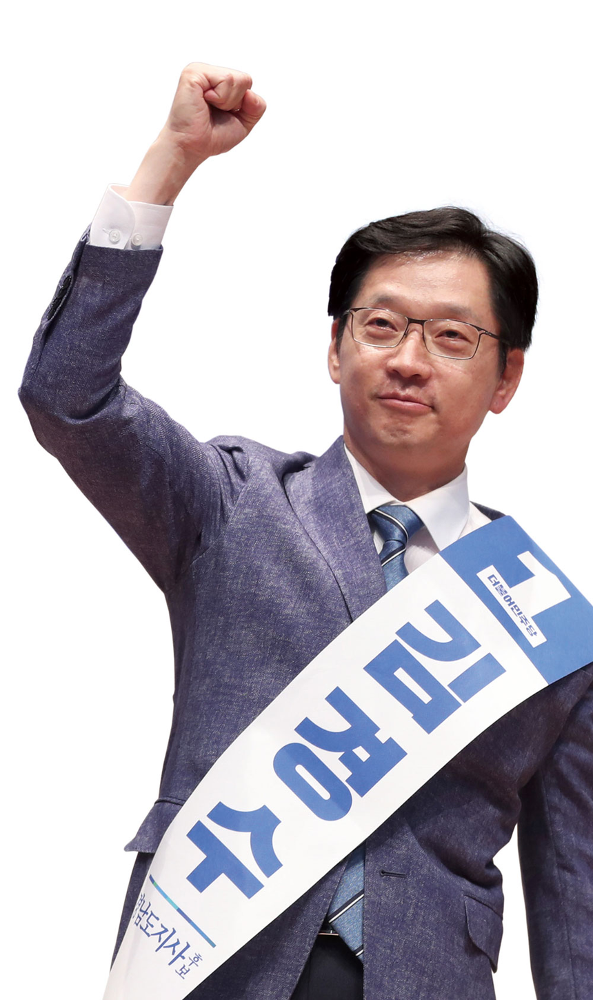 드루킹 연루 의혹은 극적 효과를 가미했다. 김 지사는 경남지사 출마 선언 직전 드루킹 연루설에 휩싸였다. 허익범 특별검사팀까지 출범하며 김 지사를 옥죄었다. 역경은 정치인을 더욱 단단하게 만드는 것일까. 김 지사는 6·13 지방선거에서 경남지사 선거에 출마해 ‘선거 불패’의 난적 김태호 자유한국당 후보를 꺾고 영남에 민주당 깃발을 꽂았다. 드루킹 연루 의혹으로 지지율 격차가 좁혀지며 위기를 맞기도 했다. 이는 오히려 긍정적 효과를 가져왔다. 민주당의 압승이 예상되는 지방선거에서 막판까지 치열한 승부를 거쳐 승리했다. 극적 효과가 더해지면서 김 지사는 민주당 승리의 상징으로 여겨졌다. 동시에 노무현 전 대통령의 마지막 비서관에서 차기 대권주자로 당당히 자리매김했다.
