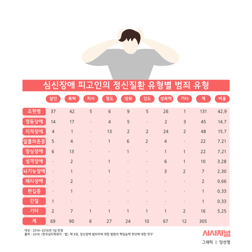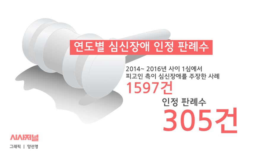 다만 법원이 심신미약을 인정하는 비율은 20% 내외입니다. 앞서 언급한 1597건 중에서 법원이 피고인의 손을 들어준 건 305건입니다. 19% 가량입니다. 어떤 질환이 이 숫자에 포함됐을까요?
