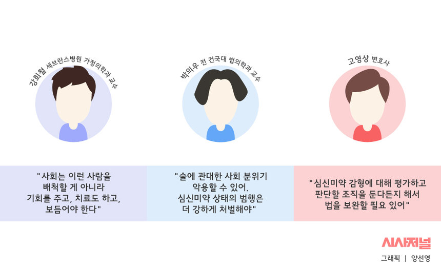 이번 강서구 PC방 살인사건에서도 알 수 있듯, 심신미약 감형에 대한 여론은 좋지 않습니다. 법리학계에서도 이를 두고 의견이 분분하다고 하는데요. 박의우 전 건국대 법의학과 교수는 시사저널에 “심신미약 상태의 범행은 더 강하게 처벌해야 한다”고 잘라 말했습니다. 특히 주취감형에 대해 “술에 관대한 사회 분위기를 악용할 수 있다”며 문제를 제기했습니다.