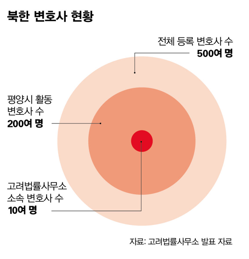 이 중 북한을 대표하는 법률사무소는 고려법률사무소다. 고려법률사무소는 2007년 6월 평양시에 설립된 북한 최초의 법률사무소로, 사무실은 평양시 중구역 대동문동에 있다. 북한판 ‘김앤장’으로 불리지만 조직의 규모나 역사 면에서는 비교할 바가 못 된다. 사무소에는 10여 명의 변호사들이 소속돼 있는 것으로 알려졌다.