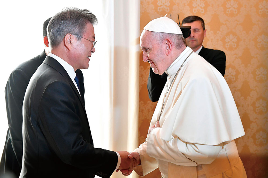 교황의 평양 방문 프로젝트는 문재인 대통령이 오랫동안 공들여 온 프로젝트라 할 수 있다. 문 대통령은 지난해 5월 취임 직후 한국 천주교 주교회의 의장인 김희중 대주교를 교황청 특사로 파견했고, 한반도 평화를 위한 교황의 역할을 요청하는 친서를 전달했다. 당시는 북한의 핵과 미사일 도발로 인해 대북 선제 타격론까지 나오던 시점이다. 교황청은 전쟁이 아닌 대화와 협상을 통한 문제 해결을 강조했고, 올 들어서는 평창동계올림픽 단일팀 구성과 남북한 및 북·미 회담 성공을 지지하는 움직임을 보이기도 했다. 프란치스코 교황은 문 대통령을 접견한 자리에서 “한반도에서 평화 프로세스를 추진 중인 한국 정부의 노력을 강력히 지지한다”며 힘을 실어줬다.