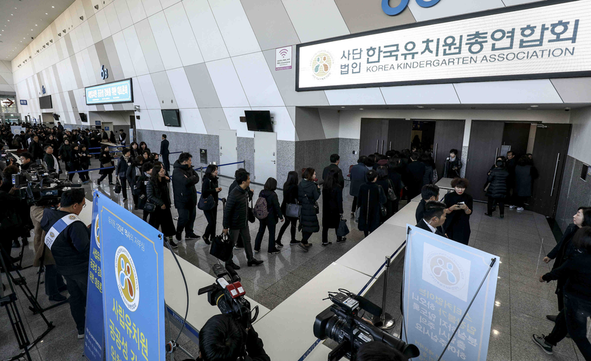 삼엄한 통제 속 시작된 전국 사립유치원 관계자 토론회…“홀에 준비된 의자 모두 찼다”