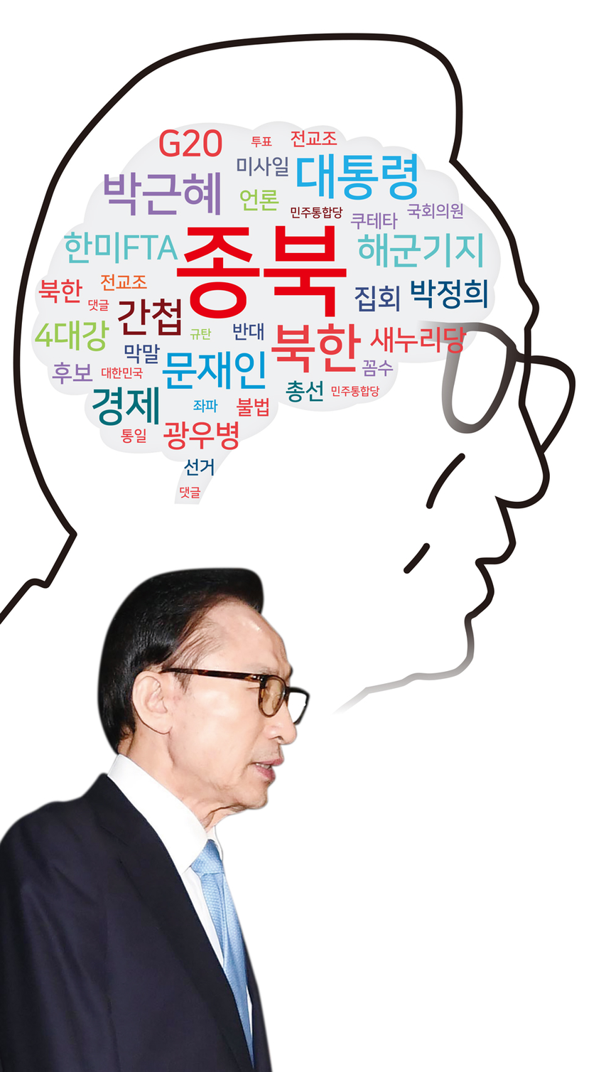14위(1300여 번)와 15위(1200여 번)를 차지한 ‘후보’ ‘대통령’은 2012년 12월19일에 치러진 18대 대선에 공권력의 인터넷 여론 조작이 있었음을 보여준다. 특히 국정원은 정권 교체를 막기 위해 ‘박근혜 대통령 만들기’에 올인했다. 이와 관련해 ‘박근혜’는 1000여 건으로 20위를 기록했다. 검찰이 확보한 녹취록에 따르면, 이 전 대통령은 2012년 대선을 앞두고 “국정원처럼 댓글을 잘해야 한다”는 취지로 다른 기관에 댓글 공작을 부추기는 발언을 했다.