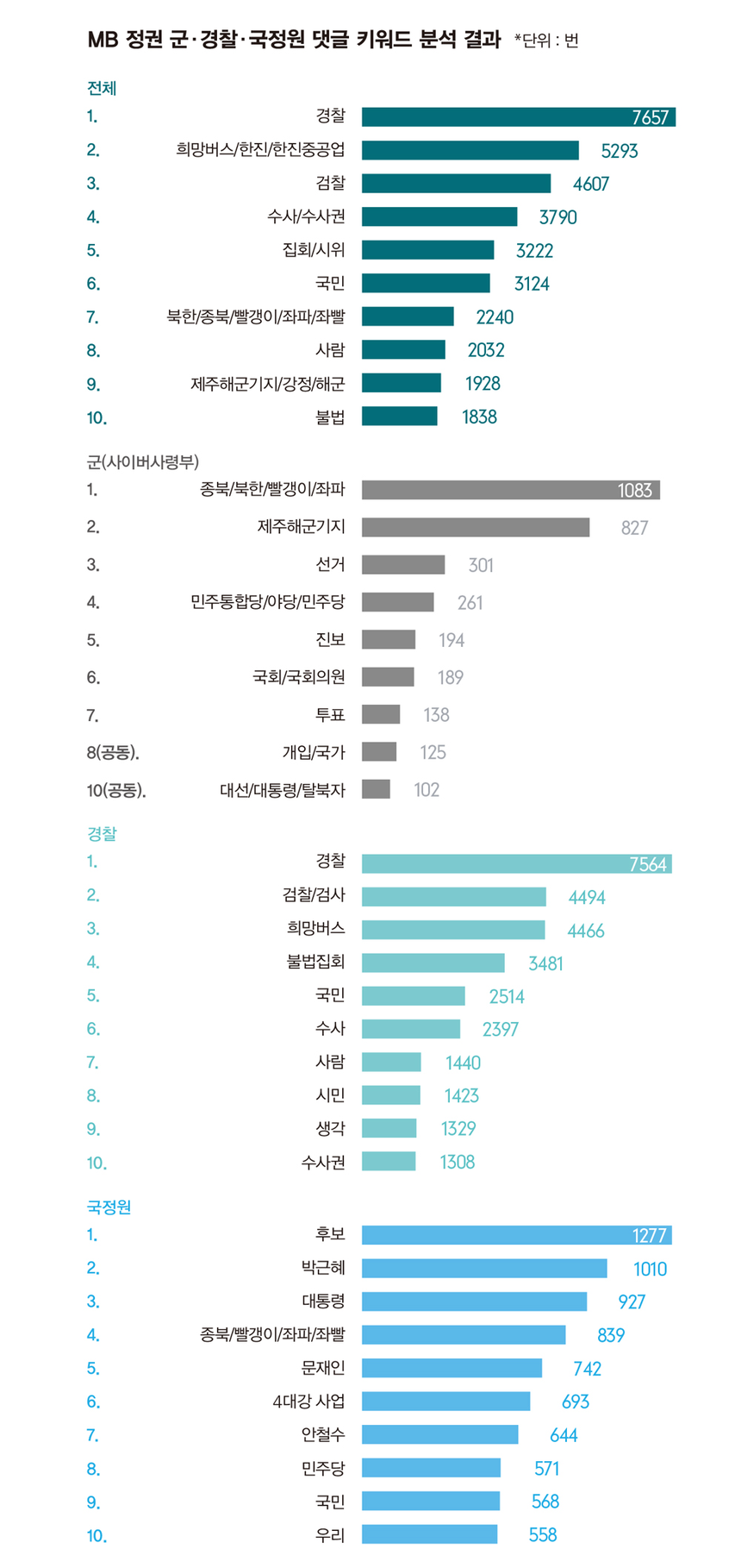 형태소(뜻을 가진 말의 최소 단위) 분석 결과, 군·경찰·국정원의 댓글에서 가장 빈번하게 언급된 것은 경찰과 관련된 이슈였다. 검경 수사권 조정과 관련된 ‘경찰’ ‘검찰’ 등과 같은 형태소가 1, 3위를 차지했다. ‘경찰’은 7600여 번, 검찰은 4600여 번 언급됐다. ‘수사·수사권’ 역시 4위(3700여 번)를 차지했다.