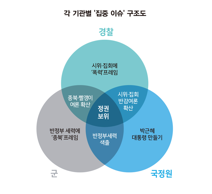 군, 안보논리 앞세워 ‘빨갱이’ 만들기 경찰, 집회·시위 참여자들 ‘범법자’ 규정 국정원, ‘박근혜 대통령 만들기’ 발 벗고 나서