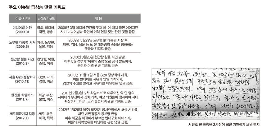 문서는 김기식, 진선미, 홍종학, 이학영, 김상희, 남인순, 최민희, 송호창, 김용익 당시 의원(이상 민주통합당)과 박원석(통합진보당), 김제남(정의당) 당시 의원 등 11명의 실명을 거론하면서 “시민단체 출신의 원내 진출 확대에 따라 국회에 제공되는 정부 자료에 기반한 폭로형 운동이 강화될 것이다. 제주해군기지, 한·미 FTA, 4대강, 원전 정책에 대한 반대 움직임이 거세질 것”이라고 전망했다. 다음은 국정원의 댓글이다. MB 청와대와 국정원이 한 몸처럼 움직인 정황이 포착된다.