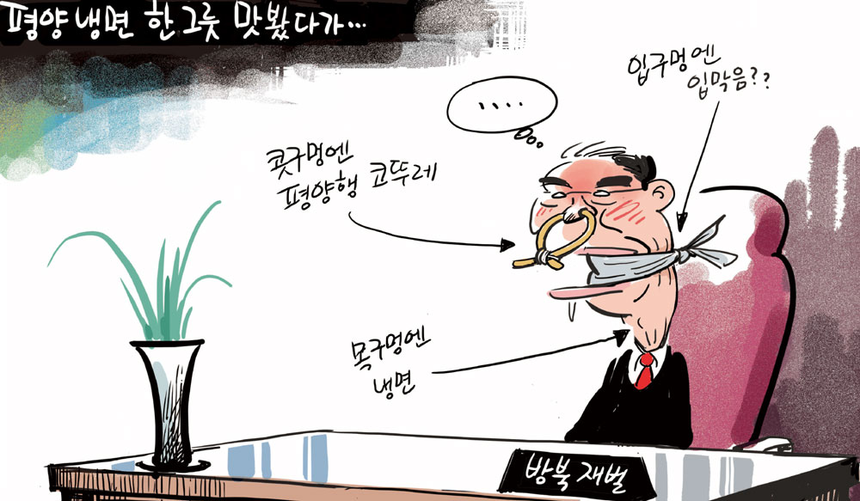 국내 대기업 총수들의 평양 방문 때 리선권 북한 조평통 위원장이 식사 자리에서 총수들에게 "지금 냉면이 목구멍으로 넘어갑니까"라고 면박성 발언을 했다는 주장이 제기되면서 여론이 들끓고 있다. 자유한국당은 "국민의 자존심을 지키지 못한 데 대해 청와대는 사과하라"며 조명균 통일부장관 해임안을 냈다. 당시 평양을 방문했던 대기업 총수들은 이래저래 불편한 상황이 됐다.