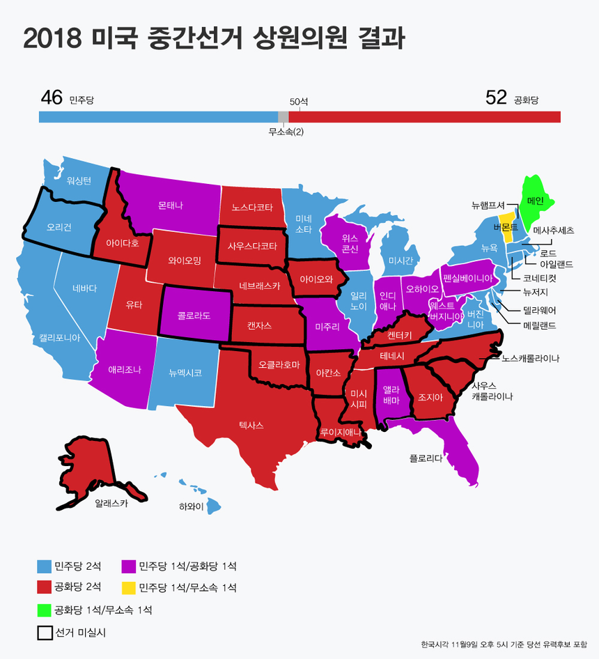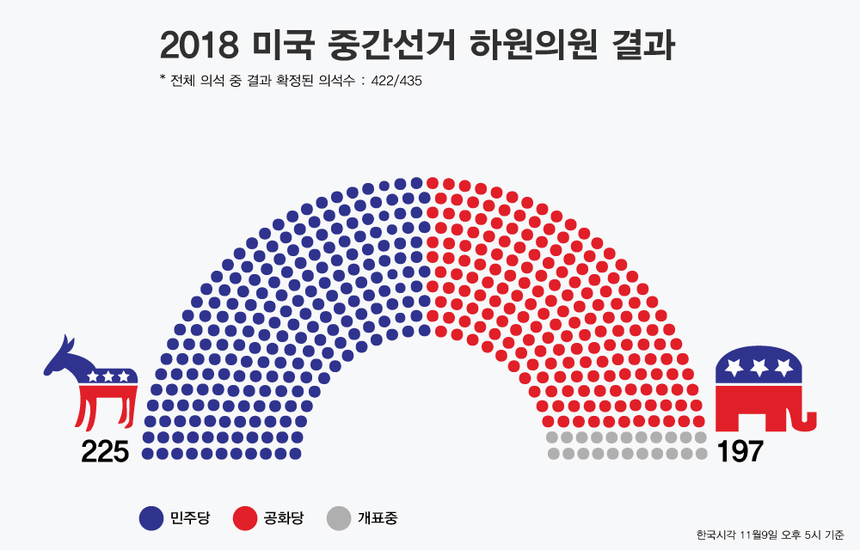 11월9일 오후 5시(한국 시각) 현재 미국 중간선거 개표 결과는 다음과 같다.