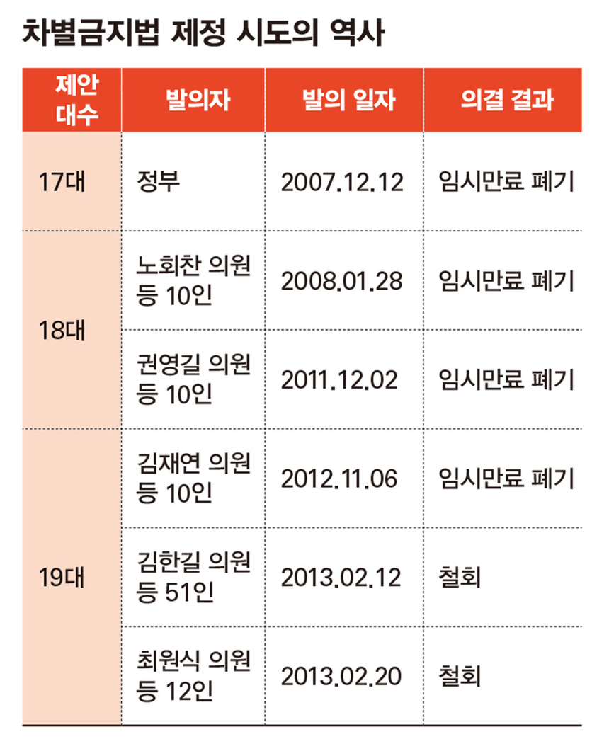 정치권이 차별금지법 추진에 주저하는 이유는 법이 가진 오랜 무산의 역사 때문이다. 차별금지법은 2006년 노무현 정부 당시 국가인권위원회 권고로 본격적인 제정 논의가 시작된 이래 번번이 보수 기독교 단체의 거센 반발로 곤욕을 치러왔다. 2007년 10월 법무부는 인권위 권고에 따라 차별금지법안을 입법예고했지만 역시나 ‘성적 지향’에 대한 차별금지 항목을 문제 삼은 보수 기독교 세력의 반발에 부딪혔다. 한 차례 좌절 이후 정부가 국회에 발의한 법안은 성적 지향은 물론, 가족형태·병력·언어·범죄 및 보호처분 전력·출신국가·학력 등 7개의 차별금지 사유가 삭제된 반쪽 자리에 불과했다. 이 역시도 당시 17대 국회에서 임기만료로 폐기됐다. 18대 국회 들어와 노회찬(2008년)·권영길(2011년) 의원 등 진보정당 의원들이 다시 차별금지법안 발의를 시도했다. 하지만 그 역시 공감대를 모으지 못하고 계류하다 또다시 임기만료로 폐기됐다.