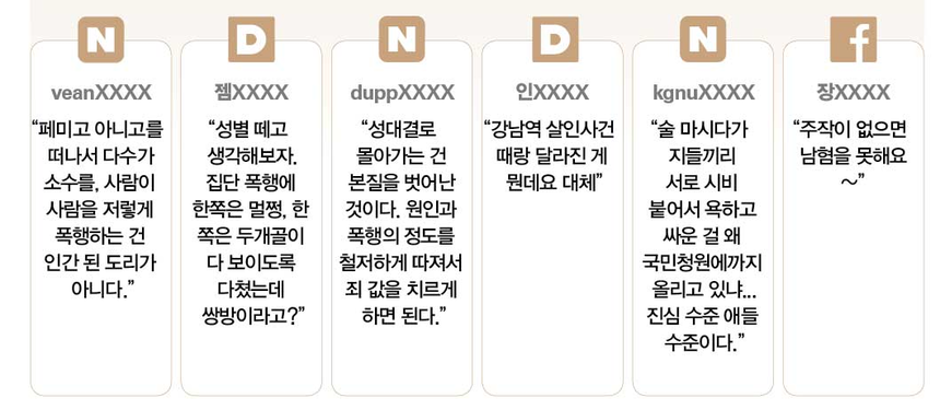 지난 11월13일 새벽 서울 동작구 이수역 인근의 한 주점에서 벌어진 남녀 간 폭행 사건이 성 대결로 번지는 모양새다. 남성 일행 3명과 여성 일행 2명이 서로 폭행한 혐의로 경찰에 불구속 입건됐는데, 피해자라고 주장하는 여성이 “머리가 짧다는 이유로 남자에게 맞았다”는 글을 온라인에 올리며 여성 혐오 논란이 일었다. 그러나 곧이어 여성들이 남성들에게 혐오스러운 표현을 내뱉는 영상이 공개되면서 사건은 남성 혐오로 비화했다.