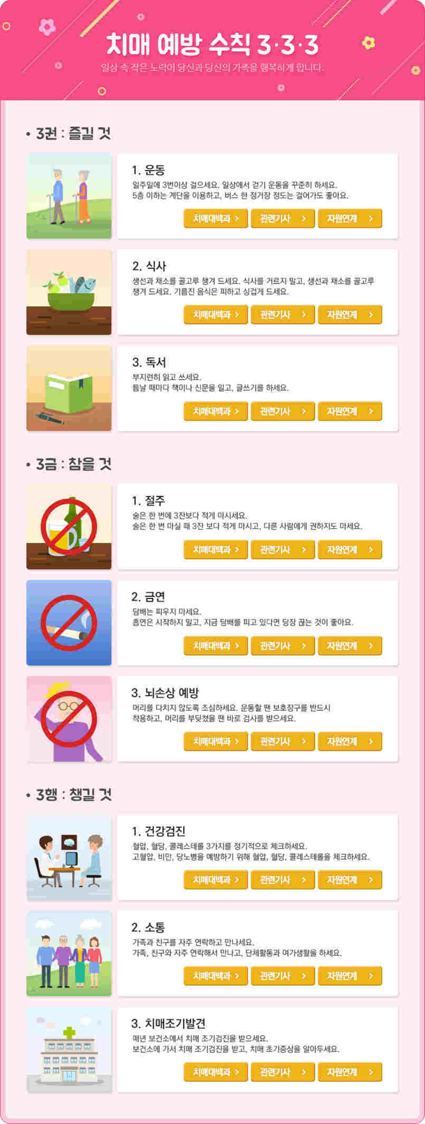 3권은 운동(일주일에 3번 이상 걷기)과 식사(생선과 채소를 챙겨 먹기)와 독서(읽고 쓰기)다. 3금은 절주(술은 한 번에 3잔 미만)와 금연(담배 끊기)과 뇌 손상 예방(머리 다치지 않기)이다. 3행은 건강검진(혈압·혈당·콜레스테롤 3가지를 정기적으로 점검)과 소통(가족과 친구를 자주 연락하고 만나기)과 치매 조기발견(치매안심센터에서 치매 조기 검진)이다.