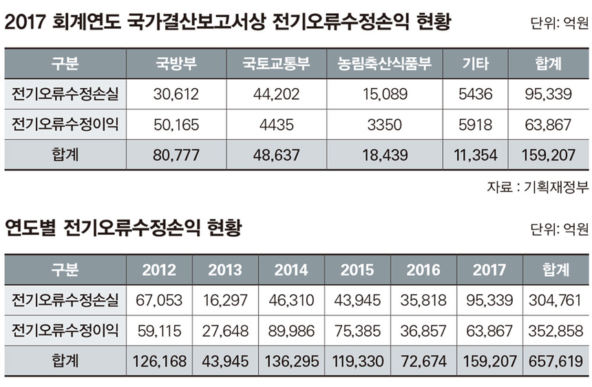 전기오류수정손익의 연도별 현황은 2012년부터 확인할 수 있다. 정부가 지출이나 비용이 발생한 시점을 기준으로 회계에 반영하는 ‘발생주의’ 방식의 국가회계 결산을 시작한 2011년 다음 연도다. 2012년 12조6168억원, 2013년 4조3945억원, 2014년 13조6295억원, 2015년 11조9330억원, 2016년 7조2674억원 등 매년 엄청난 규모의 전기오류수정손익이 발생했다. 2017년에는 15조9207억원으로, 발생주의 회계 재무제표 개시 이후 가장 큰 규모의 전기오류수정손익이 발생했다.