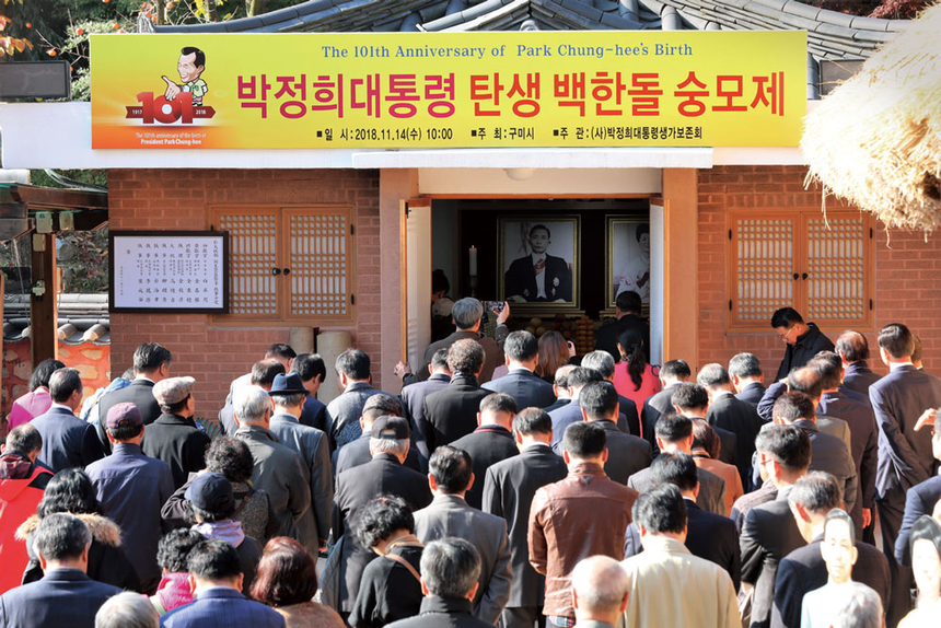 11월14일 경북 구미 박정희 전 대통령 생가에서 열린 박 전 대통령의 101번째 탄신제 현장. 박근혜 전 대통령 탄핵 이후 눈에 띄게 발길이 줄었던 생가에 전국 각지 1000여 명의 시민들이 모여 모처럼 일대가 북적였다. 연중 가장 많은 방문객이 이곳에 모이는 날이다. 곳곳엔 박정희 전 대통령을 향한 축하와 그리움의 문구가 쓰인 현수막이 걸렸다. 하늘에 그와 육영수 여사 사진이 나란히 띄워졌다. 이철우 경북지사는 물론, 김진태·백승주·윤상현 자유한국당 의원과 조원진 대한애국당 대표 등 보수진영 인사들도 일찍이 자리를 메웠다.