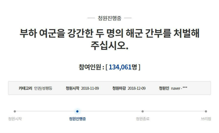 하지만 11월8일 서울 용산구 고등군사법원에서 진행된 항소심에서 C대령은 원심을 깨고 무죄를 선고받았다. 성폭행 과정에서의 폭행 및 협박을 인정하기 어려우며, 오랜 시간이 지나 피해자의 기억이 과장·왜곡됐을 가능성이 있다는 것이 이유였다. 선고 이튿날 A대위의 여자친구는 '부하 여군을 강간한 두 명의 해군 간부를 처벌해주십시오'라는 제목의 글을 청와대 국민청원 게시판에 올렸고, 열흘 만에 13만 명이 넘는 시민들이 여기에 동의했다.