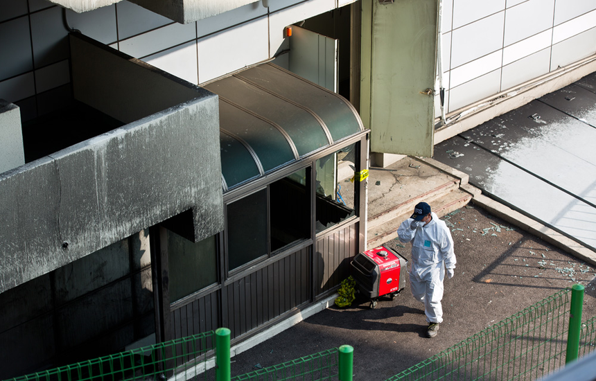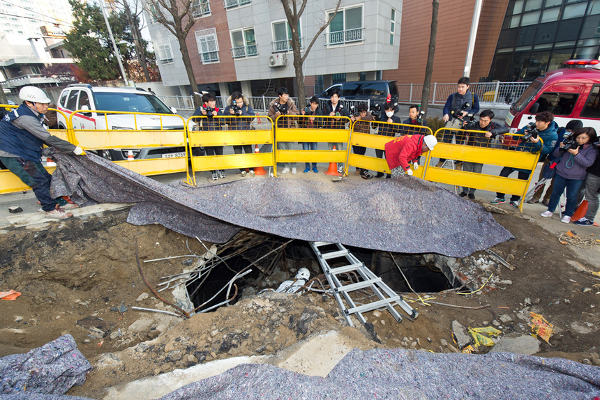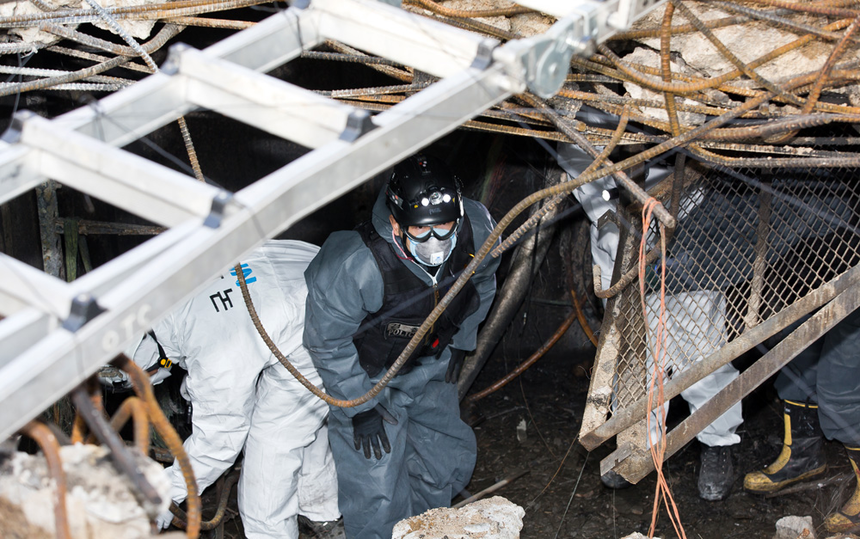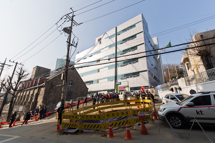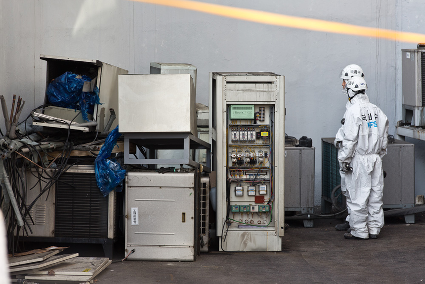 26일 오전 서울 서대문구 충정로 KT 아현국사 통신구 화재현장에서 국립과학수사연구원, 경찰, 소방대원 등이 2차 합동감식을 하고 있다. 한편 지난 24일 오전 11시 12분께 KT 아현지사 건물 지하에서 화재가 발생해 광케이블, 동 케이블 등을 태우고 10여시간 만에 진화됐다.