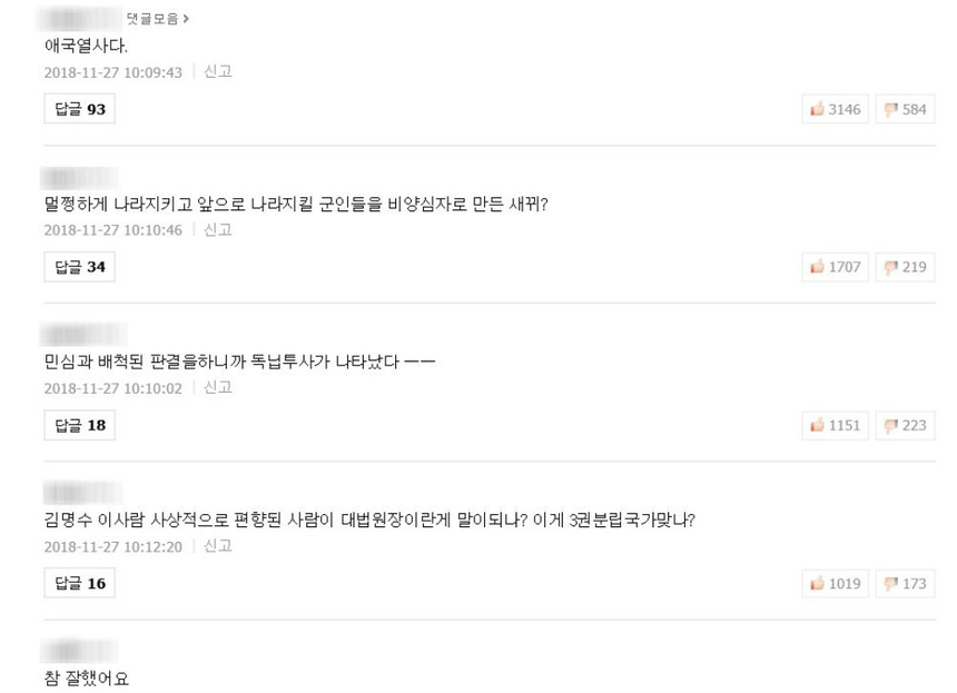 김명수 대법원장을 태운 출근 차량이 화염병에 습격당하는 일이 벌어지자 나온 네티즌 반응이다. 주요 포털 사이트 기사들엔 화염병을 던진 남모(74)씨를 옹호하는 댓글이 대부분이었다.