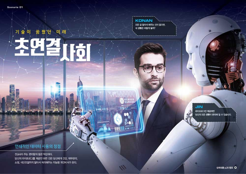 # 소설 작가인 코난은 대부분의 시간을 집에서 보낸다. 인공지능 비서 ‘진’은 코난의 라이프로그(life-log·디지털 기기를 사용해 개인의 생활 전반의 기록을 수집하는 것)를 활용해 그의 수면 시간부터 자산, 식단까지 책임지고 있다. 그러던 어느 날 코난이 심한 복통을 느껴 자율주행차를 타고 병원에 가려 했지만 진이 먹통이었다. 혼자 운전을 해본 적이 없던 코난은 길 한복판에서 배를 잡고 쓰러졌다. 알고 보니 정전 때문에 실시간 교통상황데이터가 멈춰 도로 위 자율주행자동차와 개인비서 시스템까지 고장 난 거였다. 이날 이후로 진은 이따금씩 말을 듣지 않는다. 코난은 모든 것을 진에게 맡기는 게 위험하다는 걸 깨달았지만, 진이 가져다주는 편리함이 너무 컸기에 이대로 살기로 했다.