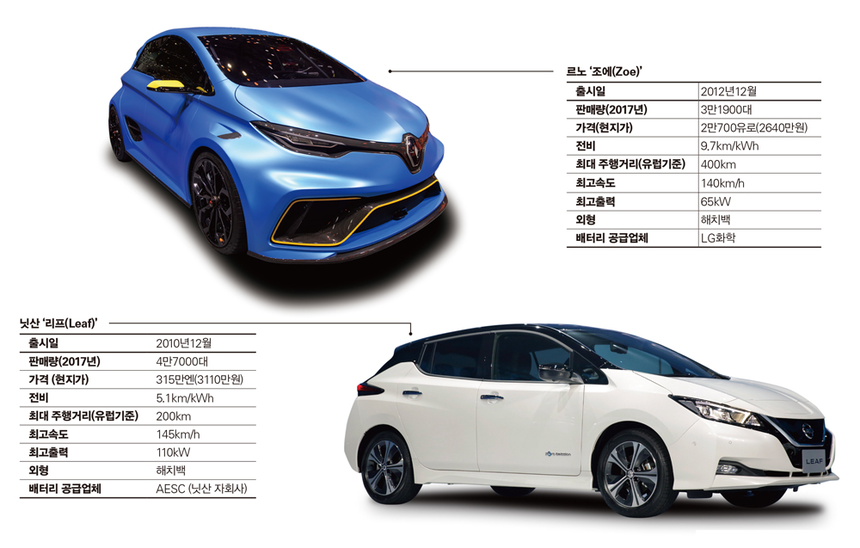 르노의 추격세도 만만치 않다. 2012년 출시한 ‘조에’는 2015~16년 유럽 최다 판매량을 기록한 전기차다. 3000만원도 안 되는 가격 덕분에 ‘가성비’로 호평 받고 있다. 무엇보다 전비(내연기관 자동차의 연비에 해당)가 강점이다. 1kWh의 전기로 9.7km를 달릴 수 있다. 전비가 5.1km인 리프보다 뛰어나다. 게다가 르노의 또 다른 모델 ‘트위지’는 1인승 초소형 전기차의 문을 연 모델로 평가받고 있다.