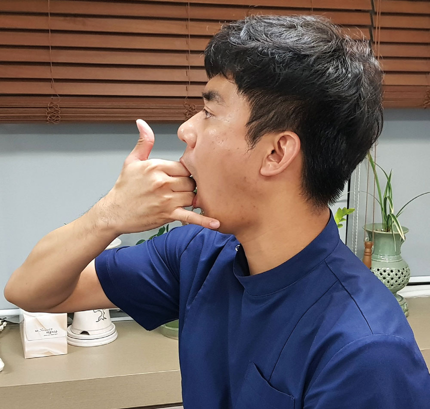 2) 거울 앞에서 입을 천천히 벌렸다 닫아보자. 입이 수직으로 벌어지지 않고 한쪽으로 틀어진다면 턱관절 이상을 의심한다.