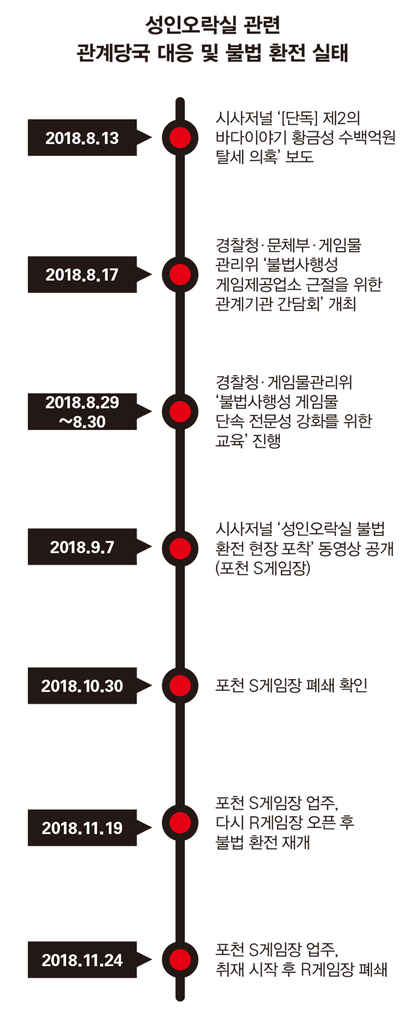 국내 성인오락실의 불법 환전이 경찰의 방만한 단속과 비호 아래 횡행하고 있다는 의혹이 한 내부고발자의 제보로 불거졌다. 앞서 시사저널은 지난 8월13일 기사(‘[단독] 제2의 바다이야기 황금성 수백억원 탈세 의혹’)를 통해 국내 성인오락실의 불법 환전 문제를 제기한 바 있다. 이후 경찰은 관련 부처와 손잡고 불법 성인오락실을 뿌리 뽑겠다고 약속했지만 허언에 불과했다. 취재 결과, 지난 9월 일제 단속 기간에 잠시 문을 닫았던 경기와 서울 지역 성인오락실 업자들은 최근 들어 다시 업장을 열고, 게임포인트를 현금으로 교환해 주면서 하루 평균 수백만원의 매출을 올리고 있는 것으로 드러났다.