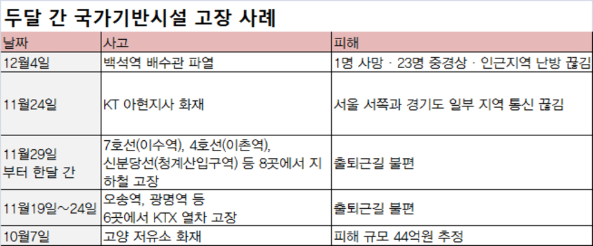 국민의 생명과 재산에 중대한 영향을 끼치는 국가기반시설이 잇따라 흔들리고 있다. 서울 KT 아현지사 통신선이 불탄 데 이어, 경기 고양시 백석역에선 온수배수관이 터졌다. 그사이 KTX와 지하철은 수차례 망가졌다. 이 같은 사고가 두 달 새 17건에 발생한 걸로 나타났다. 특히 백석역 배수관이 터진 12월4일은 모든 정부부처에서 재난취약시설을 점검하는 ‘안전점검의 날’이어서, 안전의식이 안일하단 지적이 일고 있다.