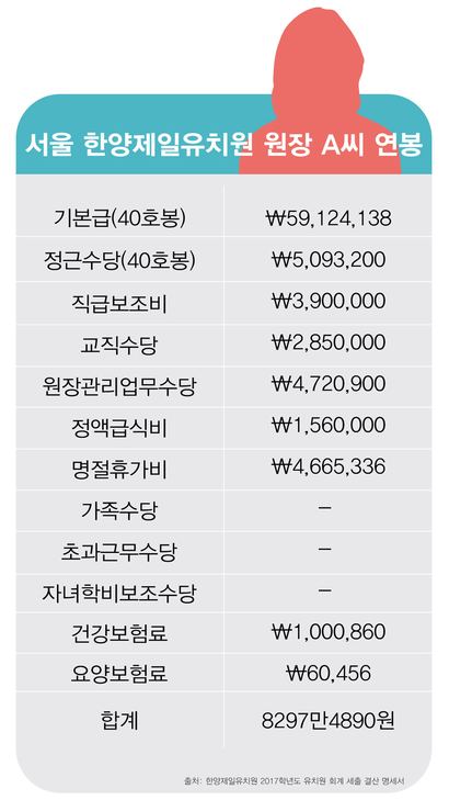 시사저널은 한양제일유치원의 '2017년 세출결산표'를 토대로 원장 연봉을 계산해봤다. 기본급은 5912만원. 이 외에 원장은 각종 수당과 복리후생비를 받는다. 단 초과근무수당이나 가족수당, 자녀학비보조수당, 사학연금료 등은 적용 여부가 불분명해 제외했다. 여기에 건강보험료 등 법정부담금을 더했다. 그 결과 연봉은 8297만원으로 산출됐다. 이를 포함해 교직원 9명에게 들어간 인건비는 총 4억 7042만원으로 나타났다. 이 외에 업무추진비가 별도로 편성된다.