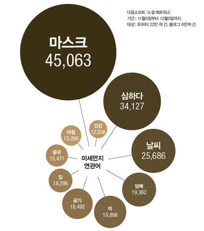 가장 많이 달라진 건 마스크와 공기청정기에 대한 인식이다. 다음소프트의 소셜 빅데이터 분석 서비스인 ‘소셜 메트릭스’에 따르면, SNS에서 ‘미세먼지’와 함께 가장 많이 언급된 단어는 ‘마스크’였다. 11월5일부터 한 달 간 트위터 22만여 건, 블로그 6만여 건에서 수집한 자료 중에서 마스크는 압도적으로 4만5000여 번 언급됐다. 이어 부정적 감정을 뜻하는 ‘심하다’가 3만4000여 번 나왔다.