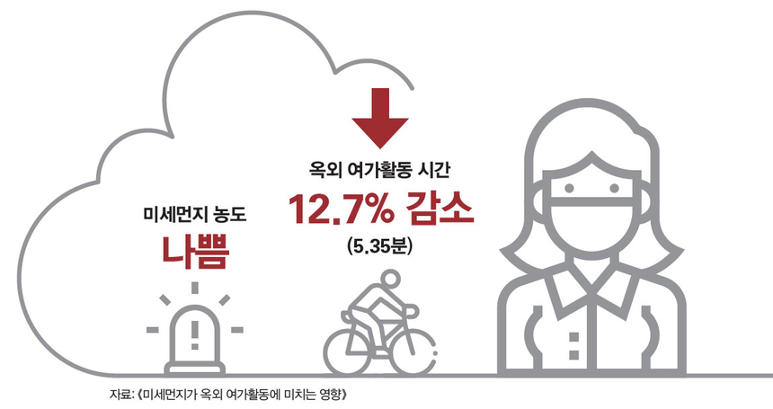 미세먼지는 여가활동에도 영향을 끼쳤다. 미세먼지 농도가 나빠지면 바깥 활동이 줄고 실내 활동이 늘어났다. 대한국토·도시계획학회지 《국토계획》에 실린 논문 ‘미세먼지가 옥외 여가활동에 미치는 영향’에 따르면, 미세먼지 농도가 권고기준(50㎍/㎥)을 초과하면 옥외 여가활동 시간이 5.35분 감소했다. 총 옥외 여가활동 시간의 12.7%다. 또 미세먼지 농도가 10㎍/㎥ 증가할 때마다 여가활동 시간은 2.31분씩 줄어들었다.