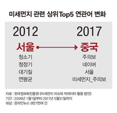 이처럼 미세먼지로 일상이 바뀐 데 대한 비난의 화살은 중국에게로 쏠렸다. 앞서 한국정보화진흥원의 보고서에서 ‘미세먼지’ 연관어 상위 30개를 연도별로 비교한 결과, 2017년의 1순위 단어는 ‘중국’이었다. 이어 ‘주의보’ ‘네이버’가 상위권을 차지했다. 반면 2012년엔 ‘서울·청소기·청정기’가 상위권을 꿰찼다. 한국정보화진흥원은 “2017년 들어 미세먼지 예보 정보의 정확성 논란이 일면서, 정보 제공처로 포털 사이트 ‘네이버’가 등장했다”고 분석했다.