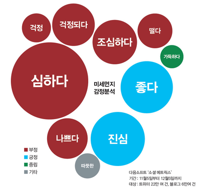 온라인에서 미세먼지에 대한 인식은 부정적이었다. 앞서 ‘소셜 메트릭스’에서 미세먼지 연관어의 감성을 분석한 결과, ‘심하다’ ‘조심하다’ ‘나쁘다’ 등 부정적 단어가 10개 중 6개였다. ‘좋다’ 등 긍정 언어는 2개에 불과했다.