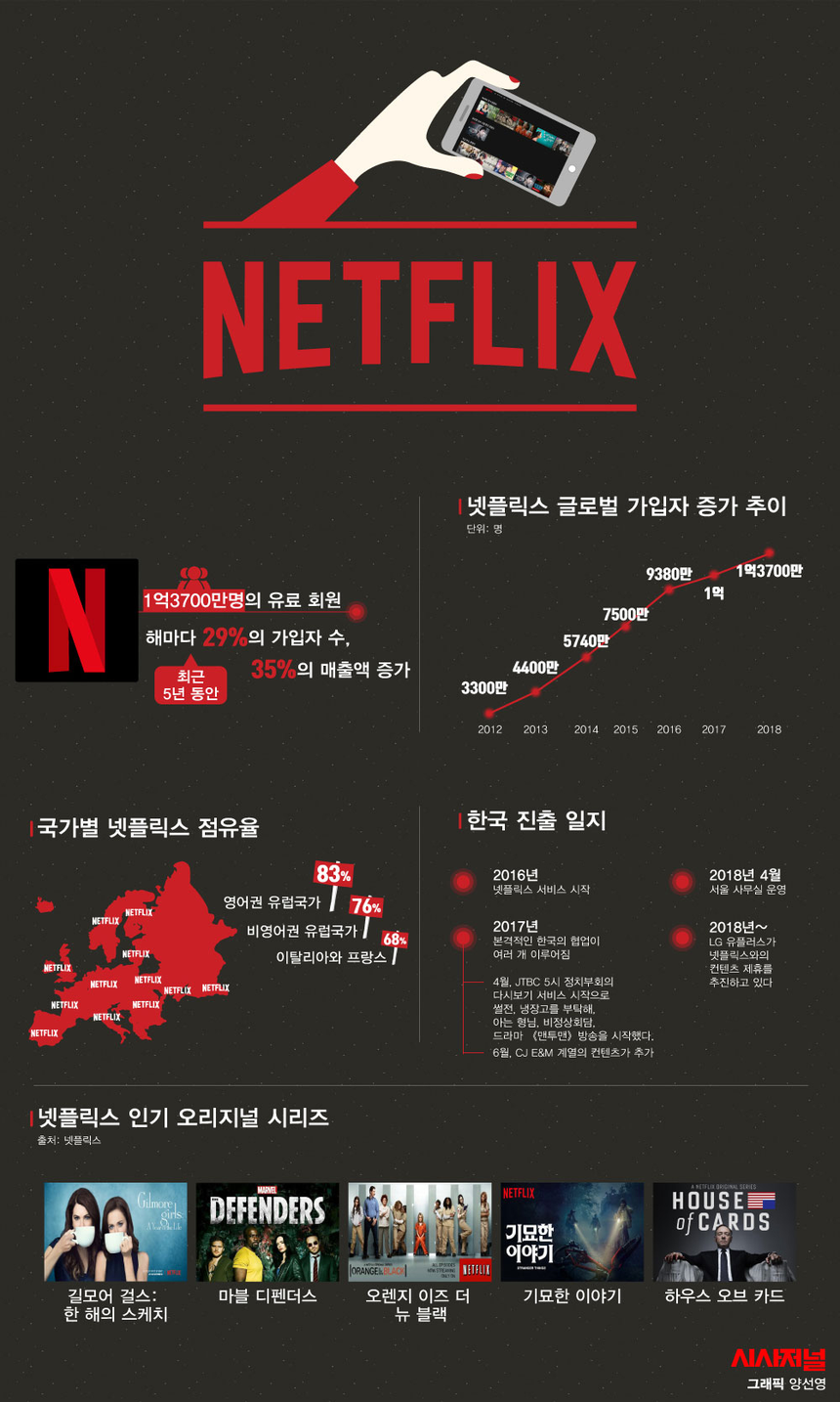 “넷플릭스에서 그거 봤어?” 유행에 민감한 요즘 젊은층 사이에서 심심찮게 들려오는 말입니다. 연말연시 모임이 많은 요즈음, 모였다 하면 넷플릭스 이야기를 합니다. 특히 넷플릭스가 최근 한국 콘텐츠 시장 진출에 본격 신호탄을 울리면서 더욱 화제가 됐습니다. 유명 작가들의 인기 드라마, 예를 들면 《미스터 션샤인》, 《킹덤》, 《알함브라 궁전의 추억》등 한국 콘텐츠를 서비스하기로 한 것입니다. 일부 전문가들은 넷플릭스가 우리 콘텐츠 시장까지 점령할 날이 멀지 않았다고 분석합니다. 넷플릭스가 도대체 뭐 길래 이렇게 인기일까요?