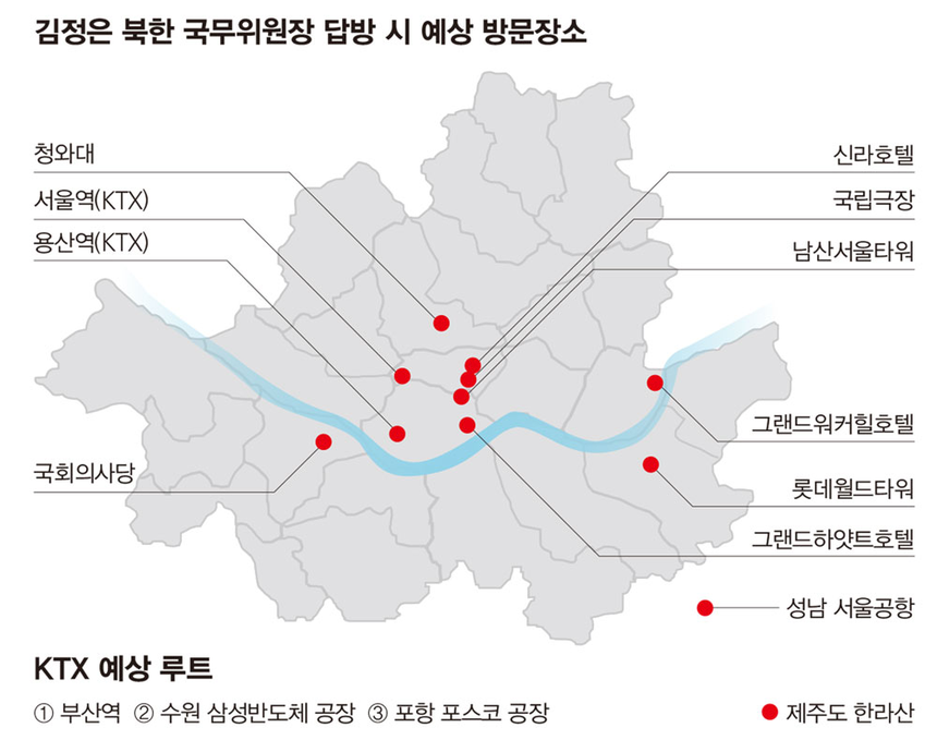 일각에선 답방 기간 중 남북 정상이 함께 KTX를 탑승할 것이란 예측도 나온다. 지난 2월 김여정 노동당 부위원장이 평창 방문 시 KTX를 탑승한 후 김 위원장은 줄곧 이에 큰 관심을 보여왔다고 전해진다. 향후 남북 철도가 연결될 경우 출발점이 될 부산을 비롯해 행선지에 대한 추측은 제각각이다. 조성렬 수석연구위원은 “답방 시 김 위원장은 경제 이미지를 강조하기 위한 루트를 선택할 가능성이 크다”며 “KTX를 타고 삼성반도체 공장이나 포스코 공장 등을 방문할 수도 있을 것”이라고 예상했다.