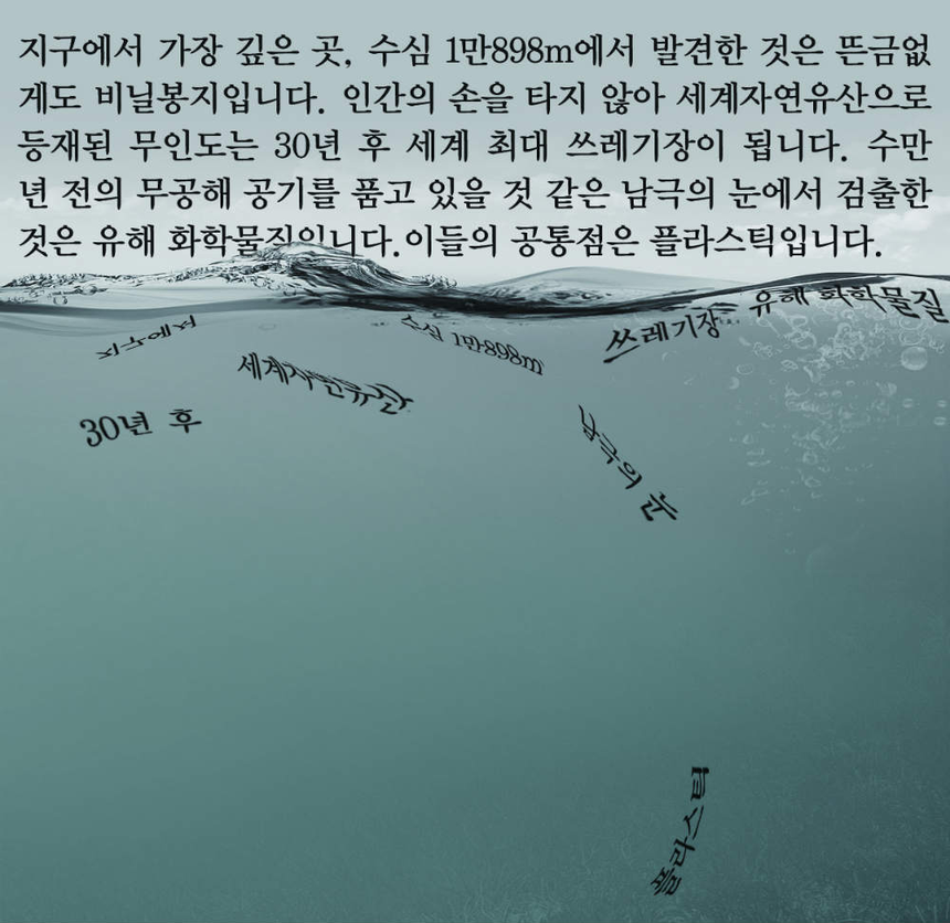 지구에서 가장 깊은 곳, 수심 1만898m에서 발견한 것은 뜬금없게도 비닐봉지입니다. 또 인간의 손을 타지 않아 세계자연유산으로 등재된 무인도는 30년 후 세계 최대 쓰레기장이 됐습니다. 수만 년 전의 무공해 공기를 품고 있을 것 같은 남극의 눈에서 검출한 것은 유해 화학물질입니다.