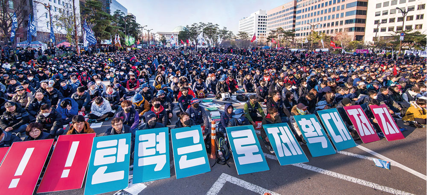 노동계 역시 맞대응 강도를 높이고 있기는 마찬가지다. 민주노총과 50여 개 시민단체로 이뤄진 민중공동행동은 12월1일 오후 서울 여의도 국회 앞에서 ‘2018 전국 민중대회’를 열어 문재인 정부가 개혁 역주행을 하고 있다고 주장했다. 참가자들은 “문재인 정권이 공약을 지키지 않고 각종 노동정책 등 개혁에 역주행하고 있다”며 “정부는 민중의 요구가 제대로 반영된 사회 대개혁을 이뤄내야 한다”고 요구했다. 이날 행사는 문재인 정부 출범 이후 처음 노동계가 대정부 시위에 나선 거라는 데서 예사롭게 볼 수 없다.