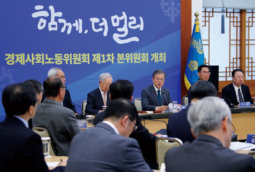 문재인 대통령도 비슷한 뉘앙스로 발언해 눈길을 끈다. 문 대통령은 11월22일 청와대에서 열린 경제사회노동위원회 출범식에서 인사말을 통해 “우리는 모두 개혁의 주체”라며 “자기 요구를 관철하기 위해 투쟁하는 게 아니라 대화와 타협, 양보와 고통 분담을 통해 합리적인 대안을 찾아야 한다”고 말했다.