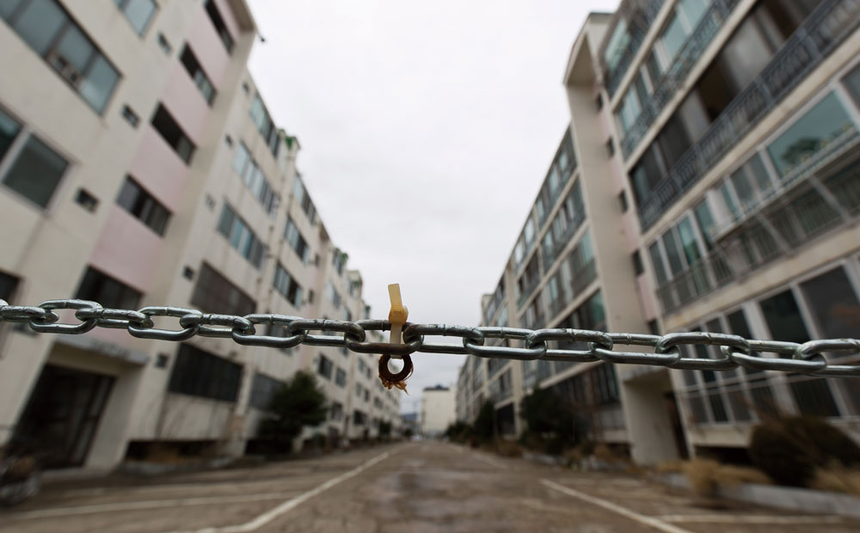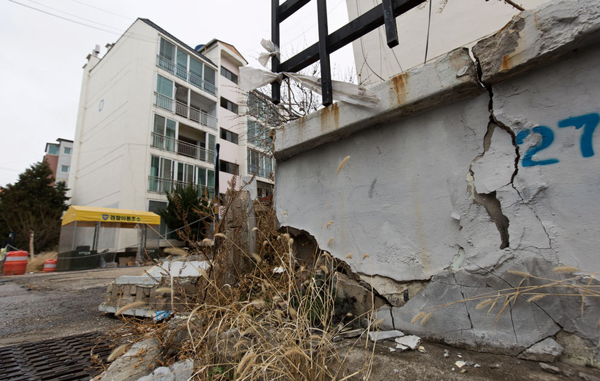흥해읍 정중앙에 위치한 대성아파트는 흉가에 가까웠다. 갈라진 건물 벽 틈 사이로 빗물이 흐르고 바닥에 나뒹구는 잔해 옆으로 고양이가 어슬렁거렸다. 창문은 깨진 채로 걸려 있었고 나무는 90도로 휘어 있었다. 전체 6개 동 중에서 4개 동이 전파(기둥·벽체·지붕 등 주요 구조부가 50% 이상 파손돼 개축하지 않으면 주택 사용이 불가능한 경우) 판정을 받고 출입이 금지됐다. 굳게 걸린 쇠줄엔 ‘위험 지역이므로 출입을 금한다’는 문구가 씌어 있었다. 이 아파트는 1년 넘도록 이 상태로 버려져 있다.