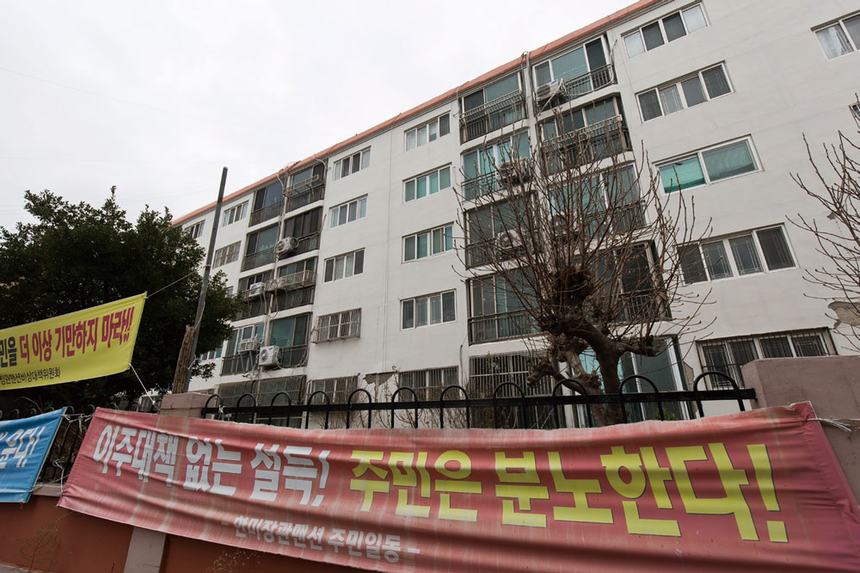 그러나 이곳 서민들은 재개발을 달가워하지 않는 눈치다. 당장 재개발을 위한 목돈을 마련할 수 없어서다. 대성아파트 B동에 거주하다 현재 대피소에서 생활 중인 옥상호씨는 “재개발한단 얘기가 있는데, 그것도 주민 부담이 있어야 되는 거지 서민 촌에서 그럴 돈이 어디서 나느냐”고 했다. 대성아파트 B동은 전파된 다른 동들과 달리 소파 판정을 받았다. 옥씨는 “그 결과를 인정할 수 없고, 다 무너져가는 곳에서 살 수 없어서 대피소에 와 있다”고 말했다.