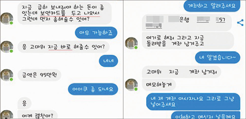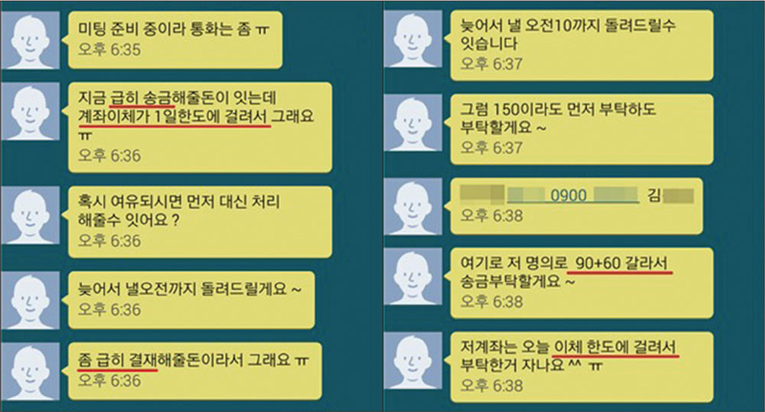 보통 사기범은 피해자의 가족, 친척, 친구, 지인, 직장 상사 등을 사칭한다. 군대에 간 아들까지 사칭해 메신저를 통해 돈을 요구한 사례도 있었다. 돈을 요구하는 방법도 다양하다. ‘교통사고’ ‘병원비’ ‘거래처 결제’ ‘카드 비밀번호 오류’ 등을 내세운다. 이 중에서 카카오톡으로 지인을 사칭해 “급히 거래처에 결제를 해야 하는데 카드 비밀번호 오류로 보내지지 않는다”면서 타인 계좌로 이체를 요청한 사례가 많았다.