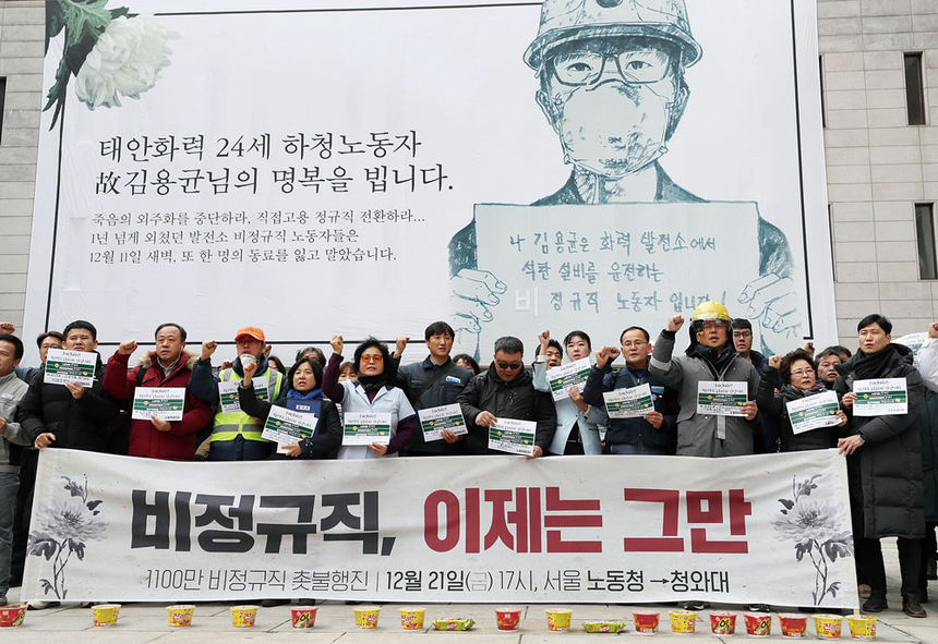 태안화력발전소에서 일하던 김용균씨가 사망한 이후 노동계도 대책 마련을 촉구하고 나섰다. 특히 “내가 김용균이다”라며 ‘비정규직 100인 대표단’을 구성했다. 이들은 드라마 스태프와 대학 비정규직 강사, 환경미화원 등이다.