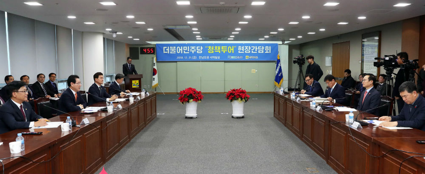 홍영표 원내대표는 이날 오후 김영록 전남지사, 이민준 전남도의회 부의장 등과 ‘청책 투어’ 현장간담회를 갖기 위해 전남도를 방문했다. 민주당 청책투어 총 10개 팀 가운데 홍 원내대표는 호남 팀을 맡았다. 이날 간담회에는 민주당 서삼석 전남도당 위원장을 비롯해 신정훈, 우기종, 윤재갑 지역위원장도 함께했다. 전남 동부권 지역위원장들은 대부분 불참했다.