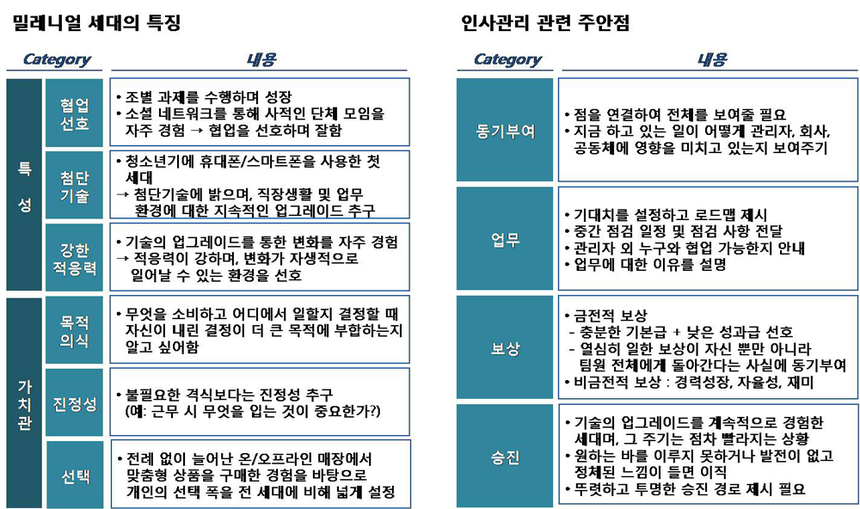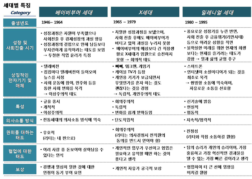 밀레니얼 세대 직장인의 특징은 기성세대에 비해 개인주의 성향이 강해 조직 충성도가 낮고, 금전적 보상보다 일의 가치와 의미를 더 중요하게 생각하며, 상명하복의 수직적인 의사소통보다 쌍방향의 수평적이고 자유로운 의사소통에 익숙하고, 여러 일을 동시에 할 수 있는 멀티태스킹 능력이 뛰어나다는 점이다. 이 세대는 기성세대와는 달리 높은 연봉을 받고 임원이 되는 것이 행복의 전부가 아니라고 생각하고 건강한 인간관계가 동반되는 의미 있는 삶을 지향한다. 그러나 이 세대는 기성세대와 전혀 다른 가치관을 가지고 있어 세대 간 갈등을 조장한다는 비판을 받고 있는 것도 사실이다.
