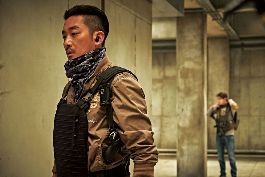 취향을 가리지 않고 쾌재를 부를 장면도 있다. 극 후반에 설계된 고공낙하 신이다. 비행기에서 점프한 후 바람의 저항을 브레이크 삼아 목표점을 향해 공중 구르기를 하는 에이헵의 율동은 《미션 임파서블》의 이단 헌트(톰 크루즈) 못지않게 박력 넘치고, 카메라의 타이밍과 액션 설계는 기존 한국영화의 용량을 훌쩍 뛰어넘을 정도로 화끈하다. 에이헵의 부족한 액션에 대한 아쉬움을 바람막이해 내는 아드레날린 역시 여기에서 터져 나온다. 안전하게 기획된 몰개성의 영화들과 거리 두기를 한 작품이라는 점에서도 《PMC: 더 벙커》의 도전은 반갑다.