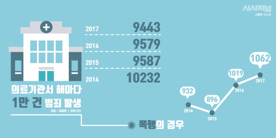 다만 폭행 사건은 늘어났습니다. 2015년 의료기관에서 발생한 범죄 건수는 896건이었는데, 지난해엔 1062건으로 증가했습니다.
